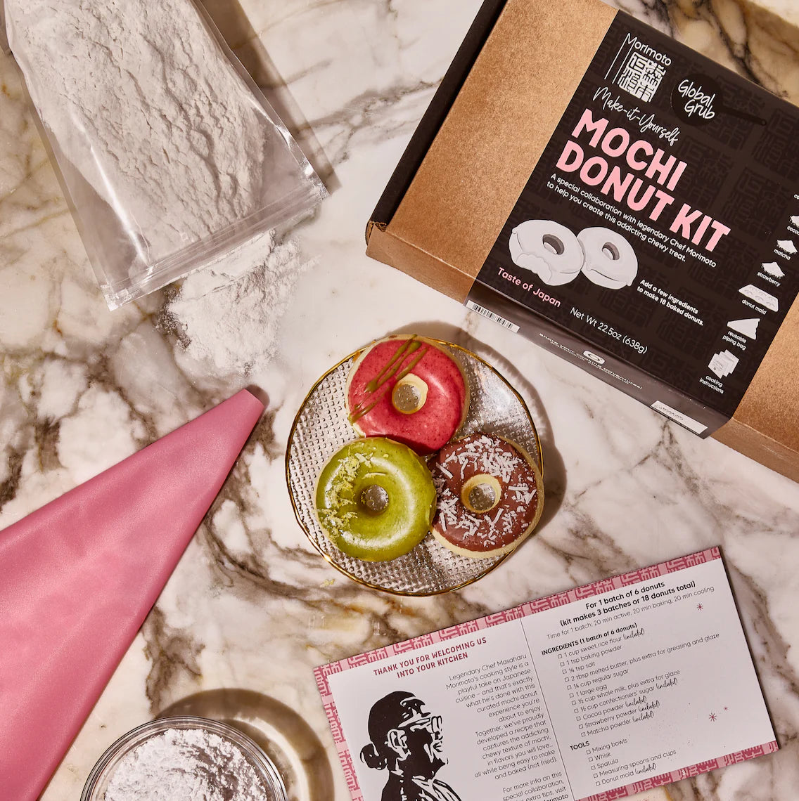 We've proudly partnered with legendary Iron Chef Morimoto so you can easily make chewy mochi donuts at home, like a master chef. Put a playful Japanese spin on your donuts with the addicting chewy texture of mochi in flavors you will love - chocolate, strawberry and matcha. Donut worry, this DIY Mochi Donut Kit makes 18 baked (not fried) donuts, so you'll have plenty to share (or not!).