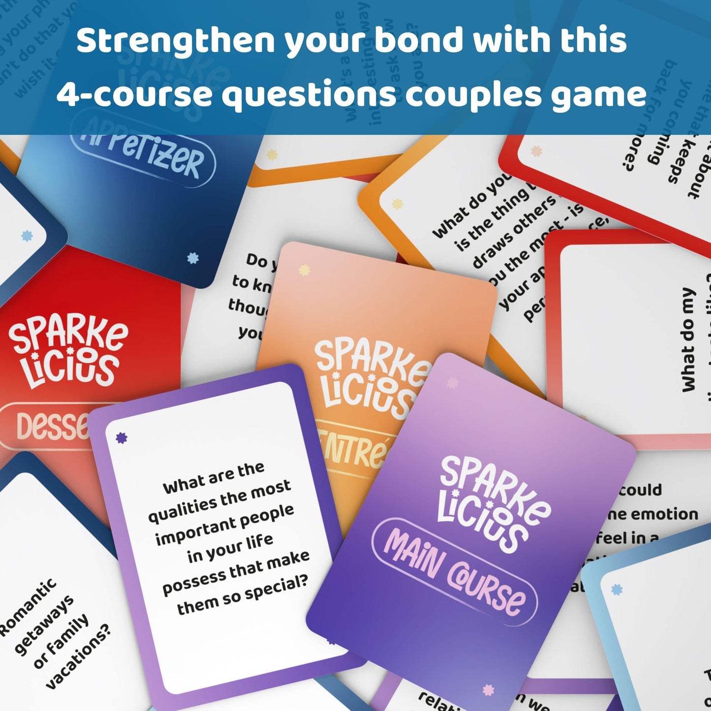 - Enjoy your date night with a card game for couples designed as a 4-course romantic dinner, including 160 thought-provoking conversation starters to help strengthen your connection with your partner. A relationship card game for married couples and long-term relationships - From playful icebreakers to prompts of values and fun, this card game is a great gift idea for him, her, husband, wife, boyfriend, girlfriend, engagement, anniversary, etc.