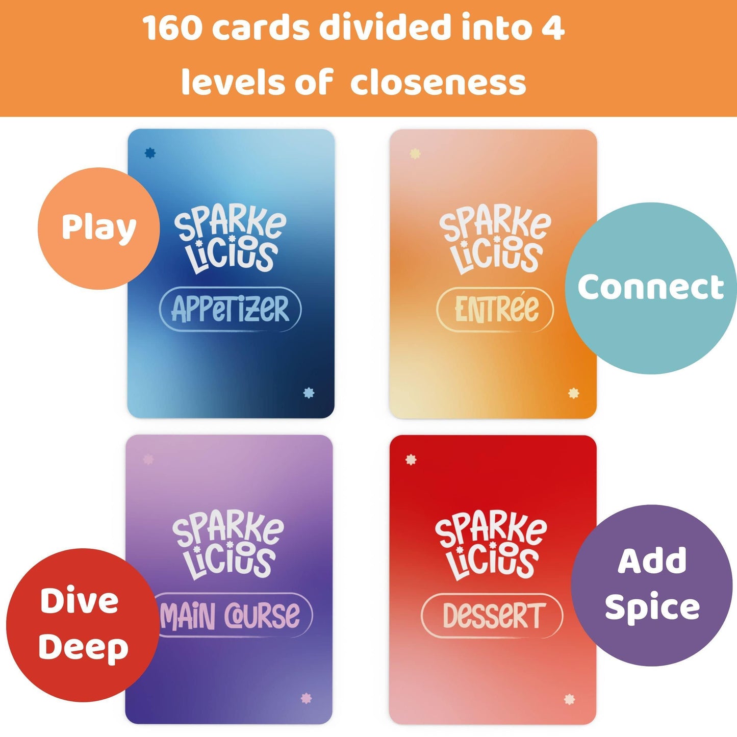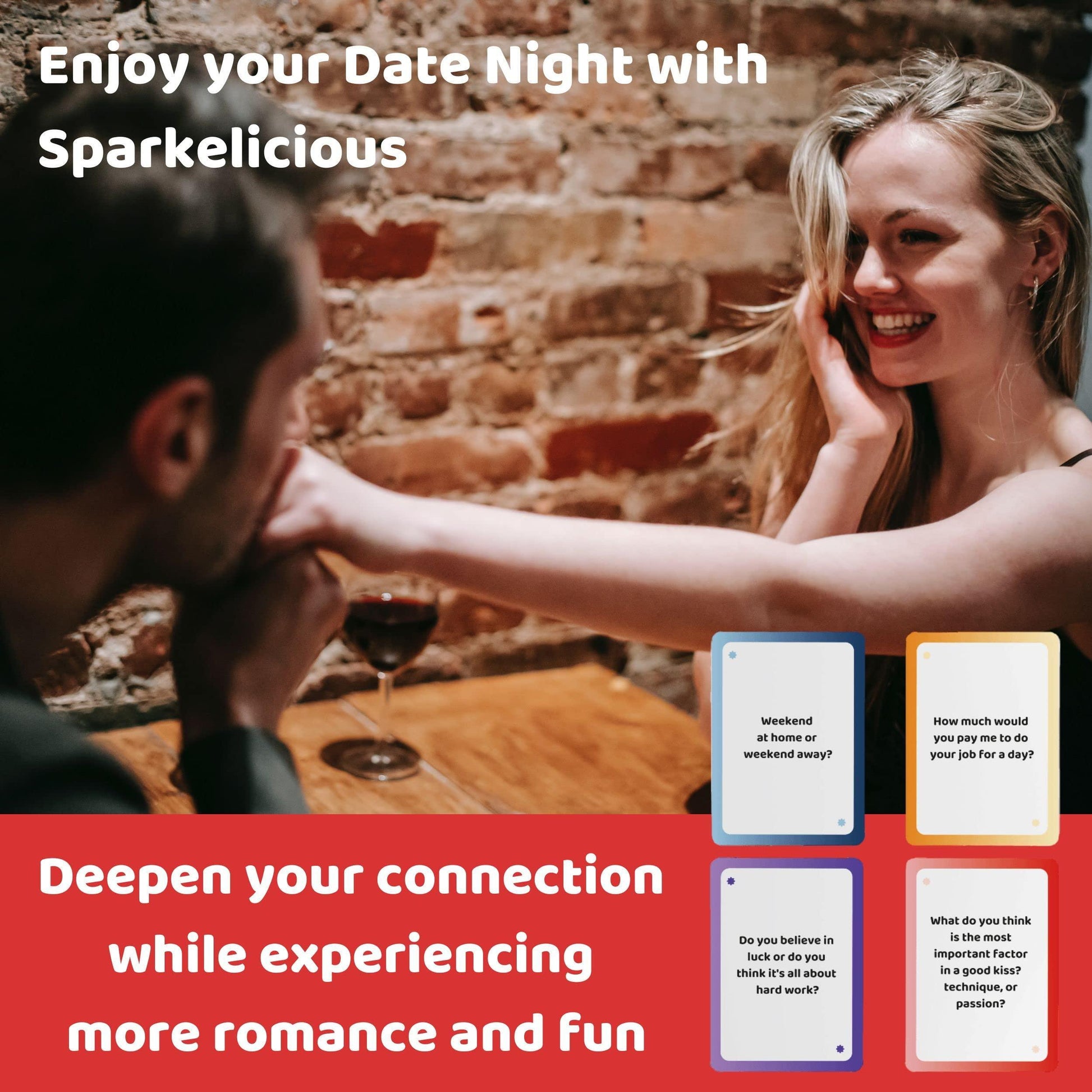 Get closer to your partner and experience more romance and fun one card at a time with Sparkelicious, a couples game thoughtfully crafted for you and your partner to celebrate your love and relationship and foster an even deeper connection. Reignite that spark between you two!