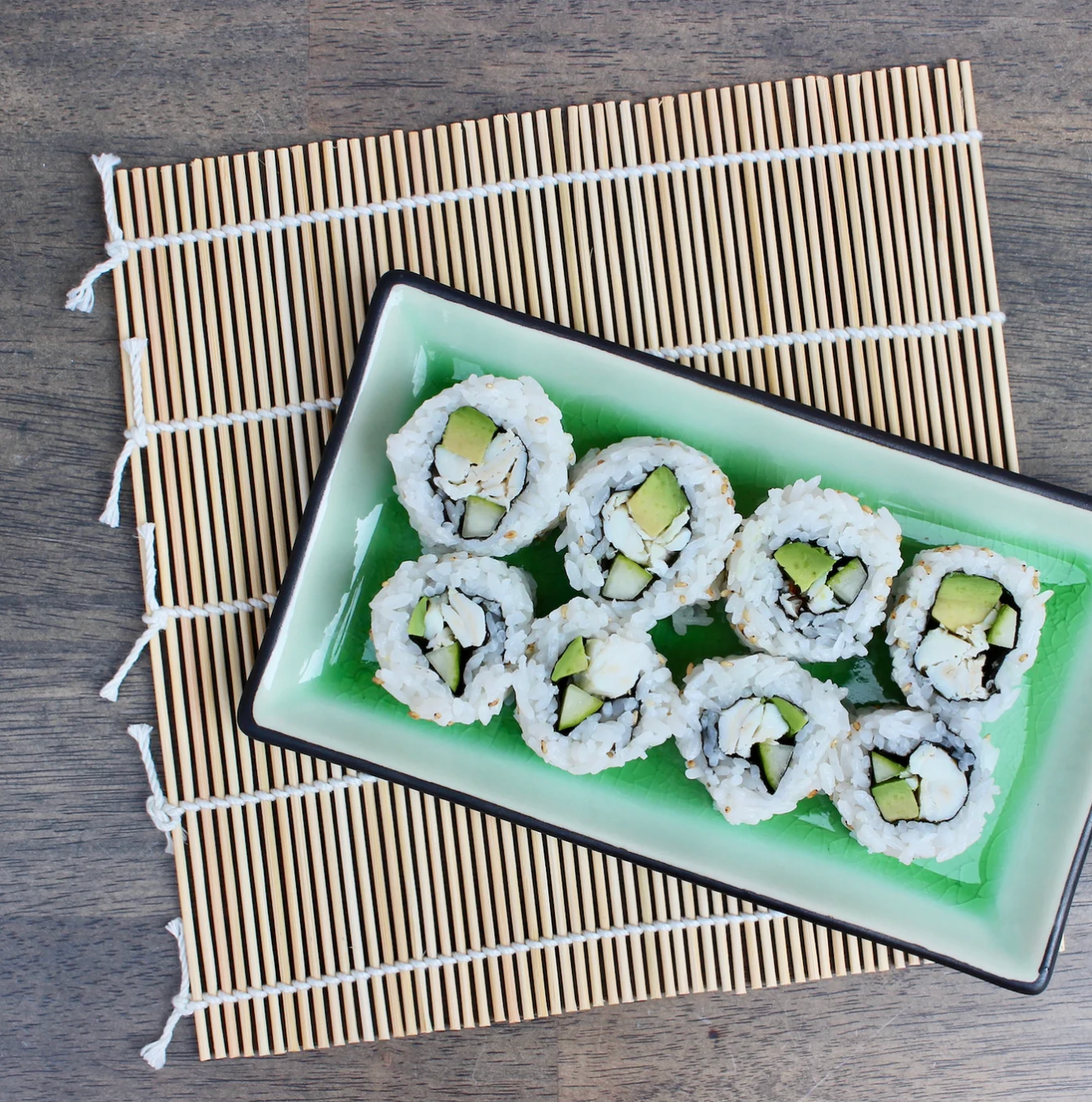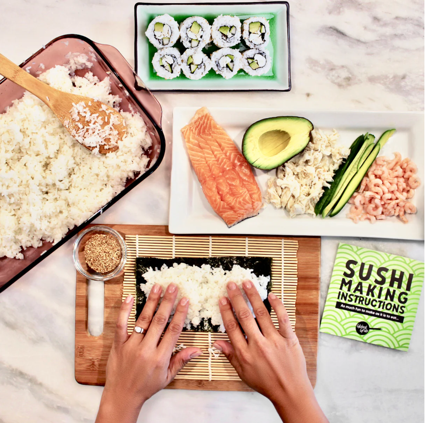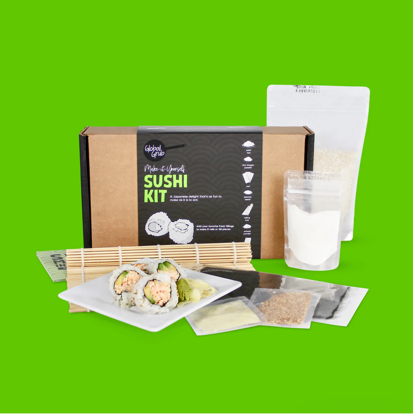 Sushi Rice, Nori, Rice Vinegar Powder, Sesame Seeds, Wasabi Powder, Rolling Mat, Instructions. Sushi Kit makes 8 rolls (48 pieces).