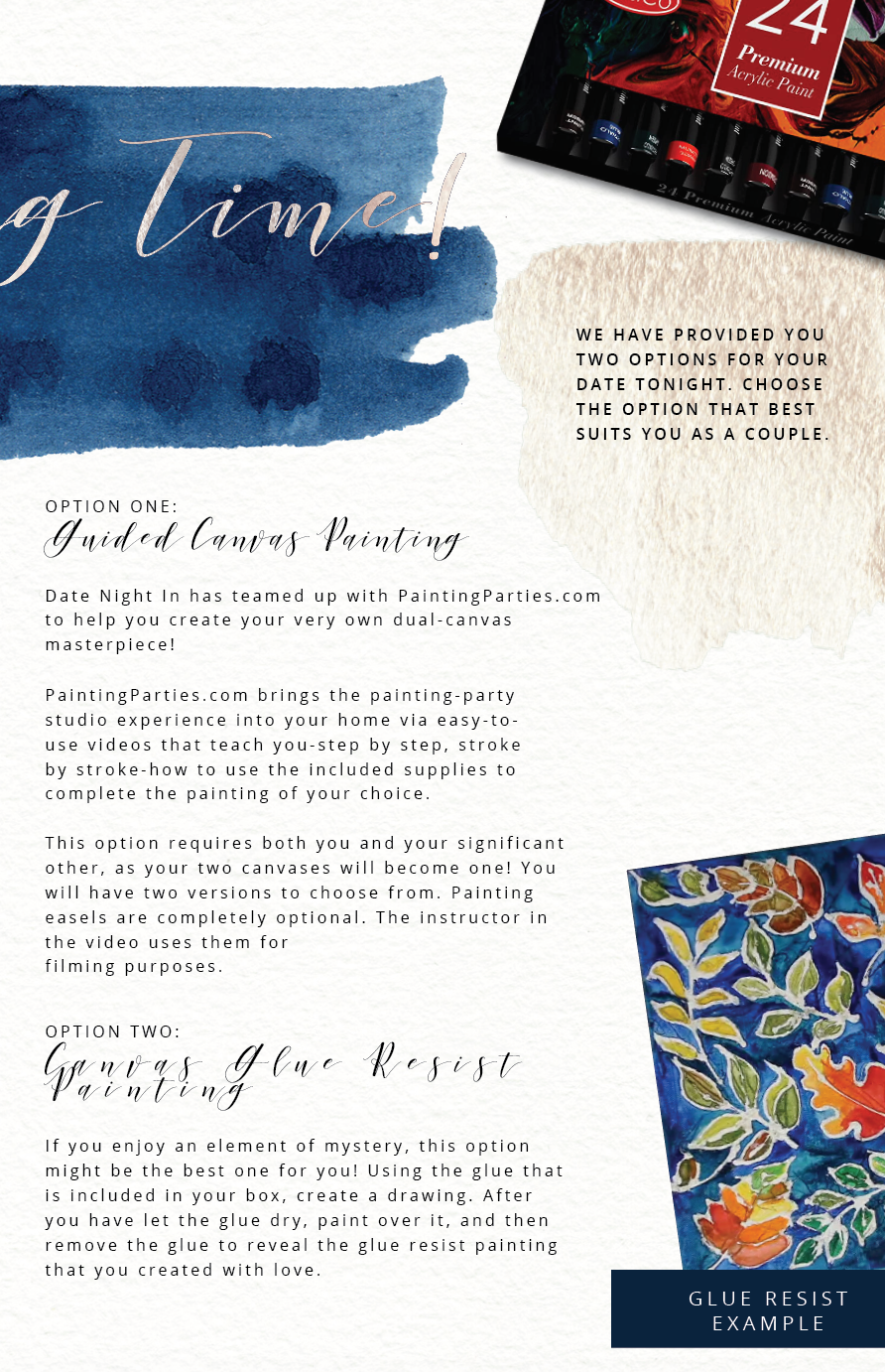 Love is an art. Our premium "Painted With Love" box features a dual canvas guided painting experience. Think painting party in the comfort of your own home.